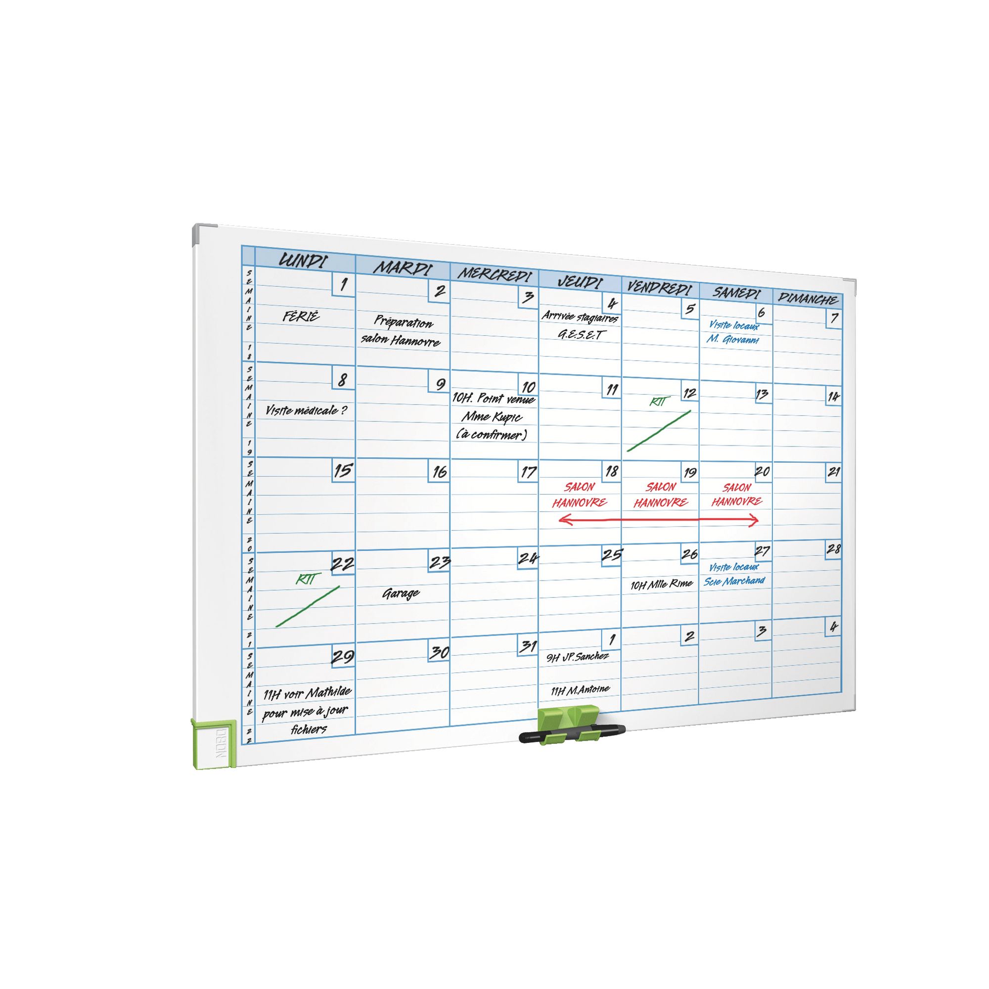 Monthly planner 7 columns for every day, 5 lines for the weeks (35 compartments). Magnetic surface, dry erasable. Months, days or year are not indicated: you need to add them yourself. With eraser. Delivered with marker, magnetic marker clip and set of rectangular magnets. With wall fixation kit. Dimensions: H 60 x W 90 cm.