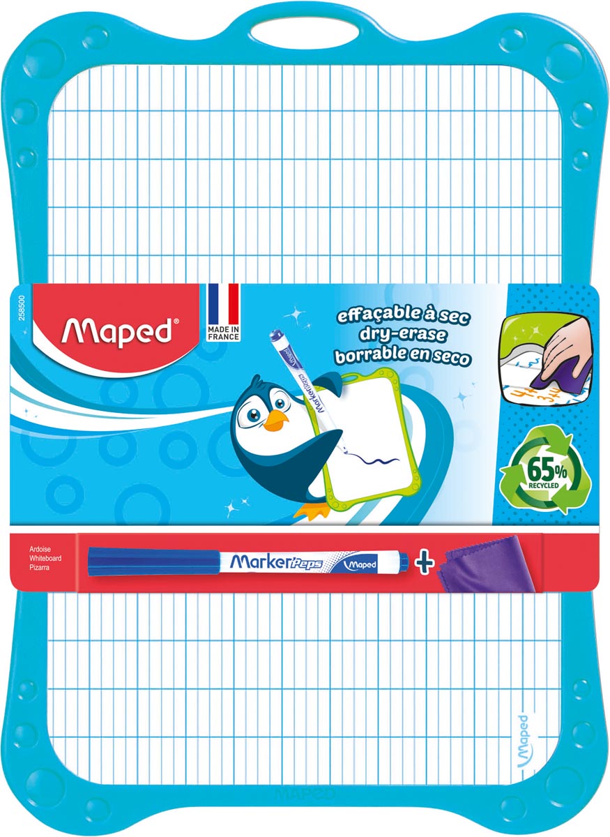 Double face: un côté uni blanc, l'autre côté quadrillé finement Effaçable à sec Encadrement en plastique recyclé Comprend 1 marqueur pour tableaux blancs et 1 chiffon Emballage 100% carton : recyclable Couleurs assorties: vert et bleu Ft 20 x 28 cm