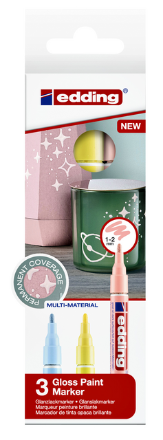 Detailled description* Marqueur peinture à encre laquée couvrante. * Encre permanente et très couvrante pratiquement sur tous les matériaux même foncés et transparents et verre. * Convient pour la décoration. * Pointe ogive. * Odeur faible. * Largeur de trait 1-2mm.