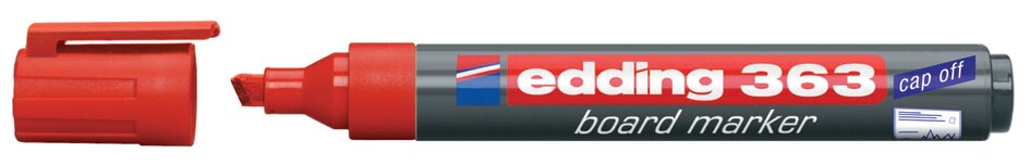 * Marqueur tableau blanc edding avec pointe biseau. * Convient à presque toutes les surfaces, résiste au frottement et à l'eau. * Technique cap-off: peut rester longtemps sans capuchon sans s’assécher. * Corps en plastique, capuchon avec pince de poche. * Encre à séchage rapide et effaçable à sec, odeur neutre. * Economique: rechargeable. * Recyclable, sans solvants toxiques. * Sans addition d'acétate de butyle. * Épaisseur de trait 1-5mm.