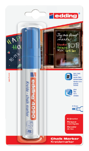 Detailled descriptionFeutre craie liquide pour vitres à pointe biseautée Craie liquide inodore à base d'eau S’efface avec un chiffon humide Utilisable également sur le tableau noir Largeur de trait 4-15mm.