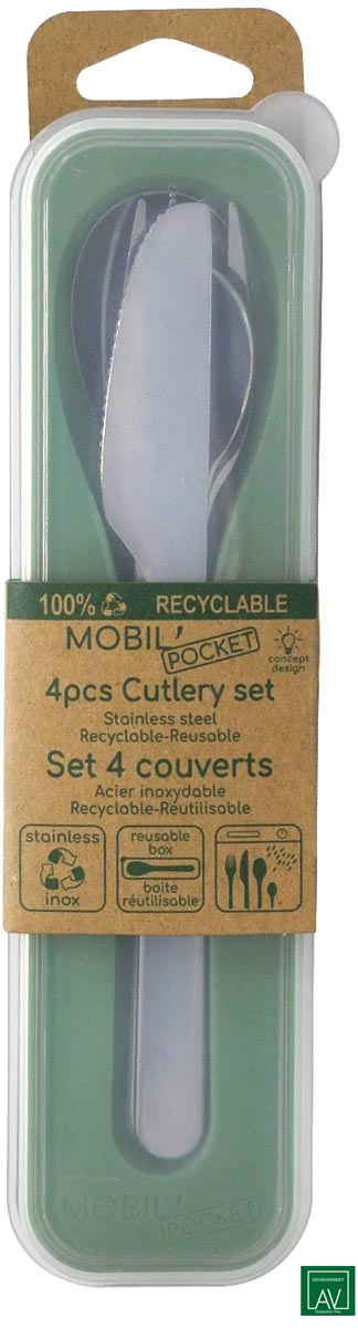 Detailled descriptionSet de 4 couverts nomades Avec étui de rangement Contenu: 1 couteau, 1 fourchette, 1 cuillère et 1 cuillère à café