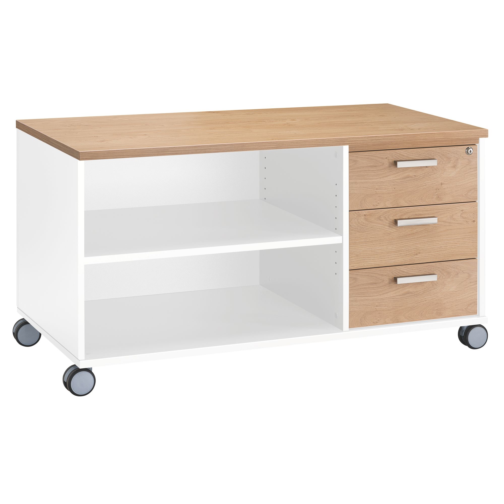 Optimize your storage space with this elegant two-tone Eden console. This model consists of a niche and 3 flat storage drawers. Practical, it is equipped with a height-adjustable shelf every 32 mm, offering 2 spacious shelves. Before installing the office furniture, you have the option to position the drawers on the right or left. Made of 16 mm thick melamine-coated particle board, the Eden console effectively resists bending and impacts.