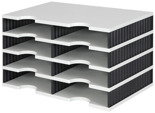 Detailled descriptionGray/black, 8 standard compartments / 4 levels, gray bottom/plateBlack lateral walls, material: polystyrene, easy assembly by interlocking,expandable and combinable, dimensions: (L)48.5 x (W)33.1 x (H)29.3 cm