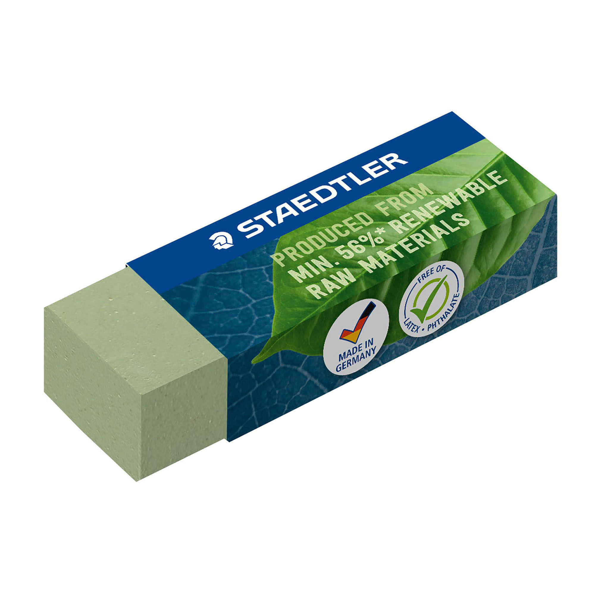The green Staedtler colored eraser is made from 56% (5% vegetable flour from olive harvest residues) of natural and renewable material according to standard EN 16785-2.