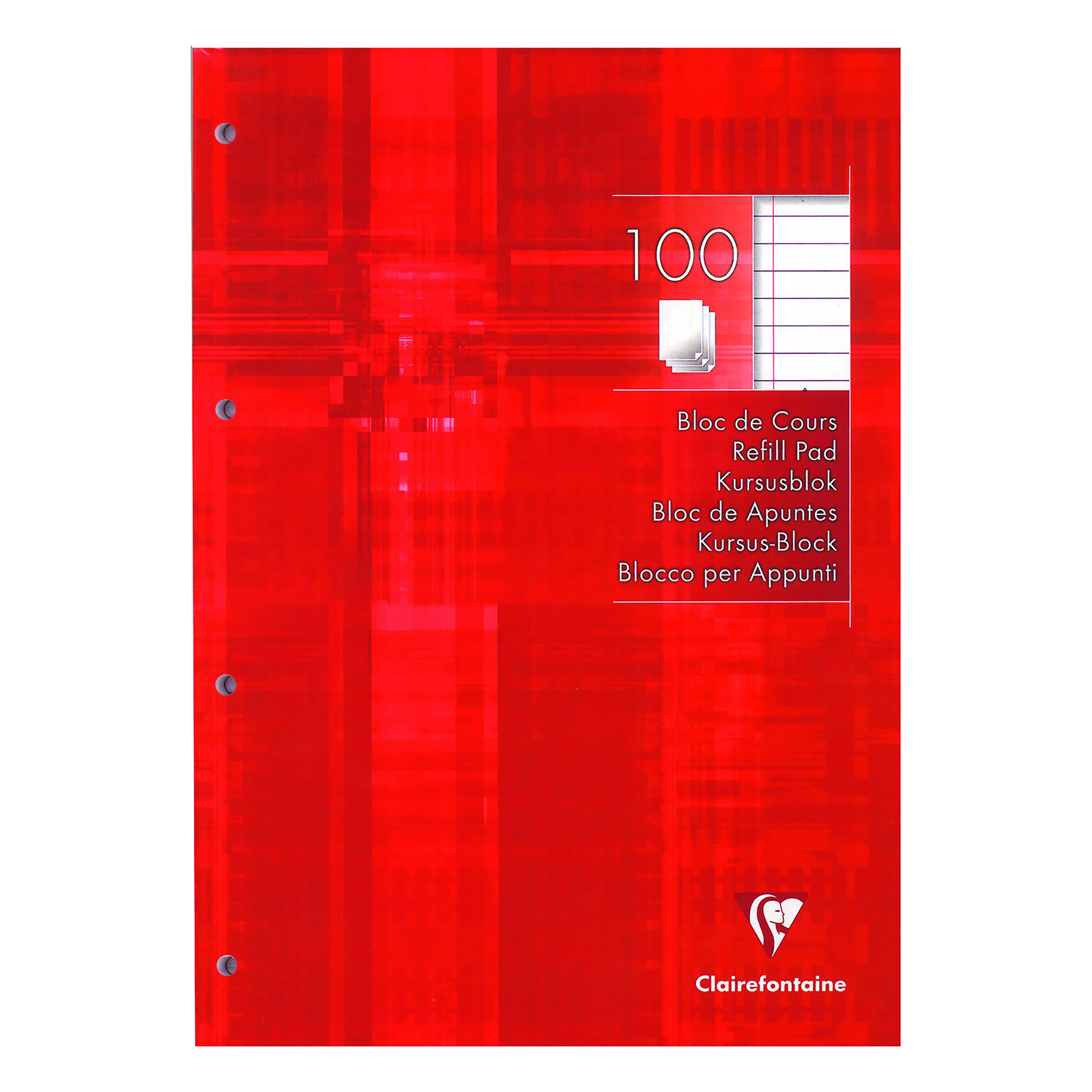 Glued on the long side. A4 format. 100 sheets. Ruled with margin. 2-hole punching. Velin velvety paper Clairefontaine 90 g/m². Laminated cover. Cardboard spine.