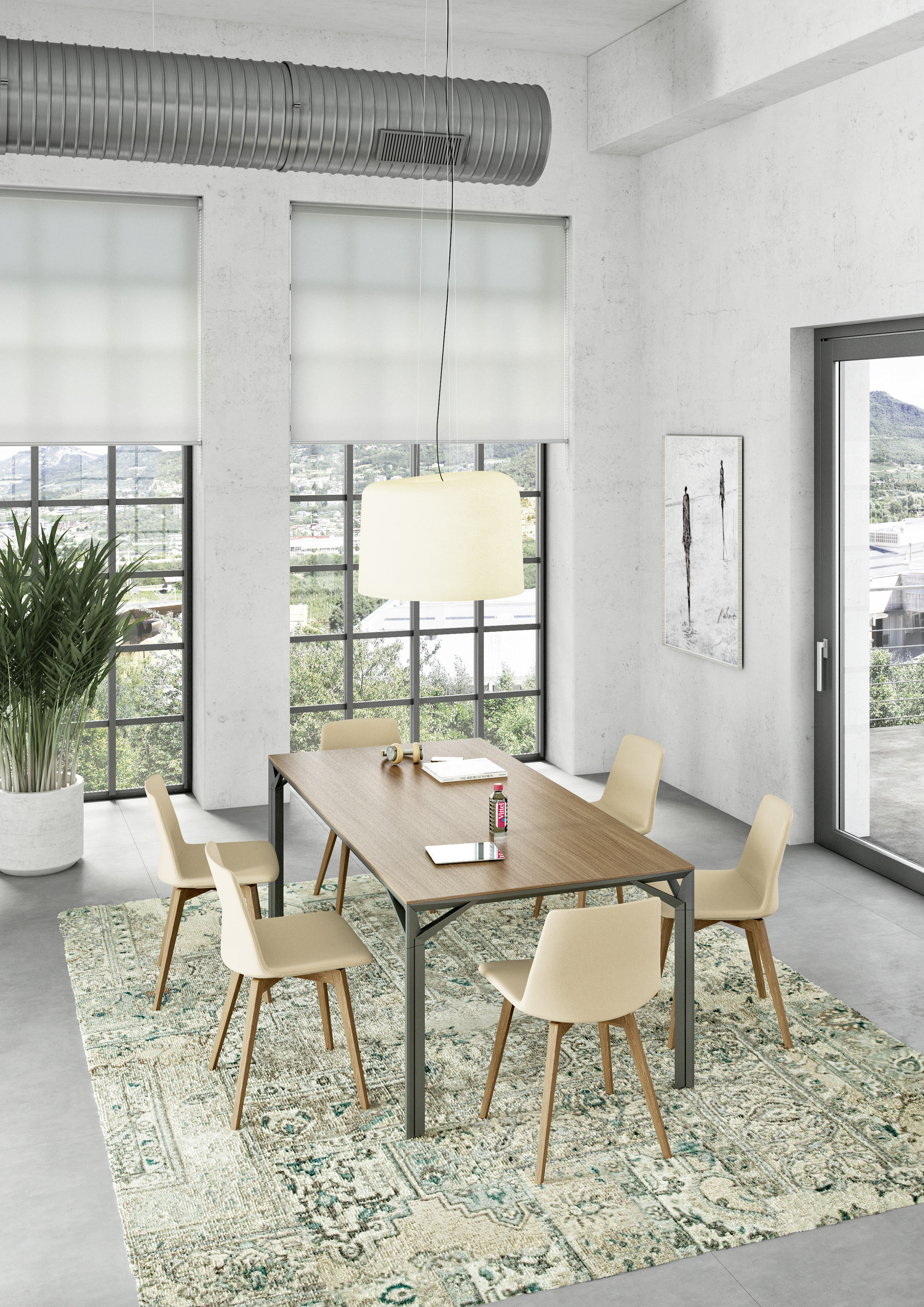 Matière : Coque en polypropylène, épaisseur 8 mm. Tissu 100% polyester non feu M1. Piètement en frêne massif vernis naturel équipé de patins en nylon.