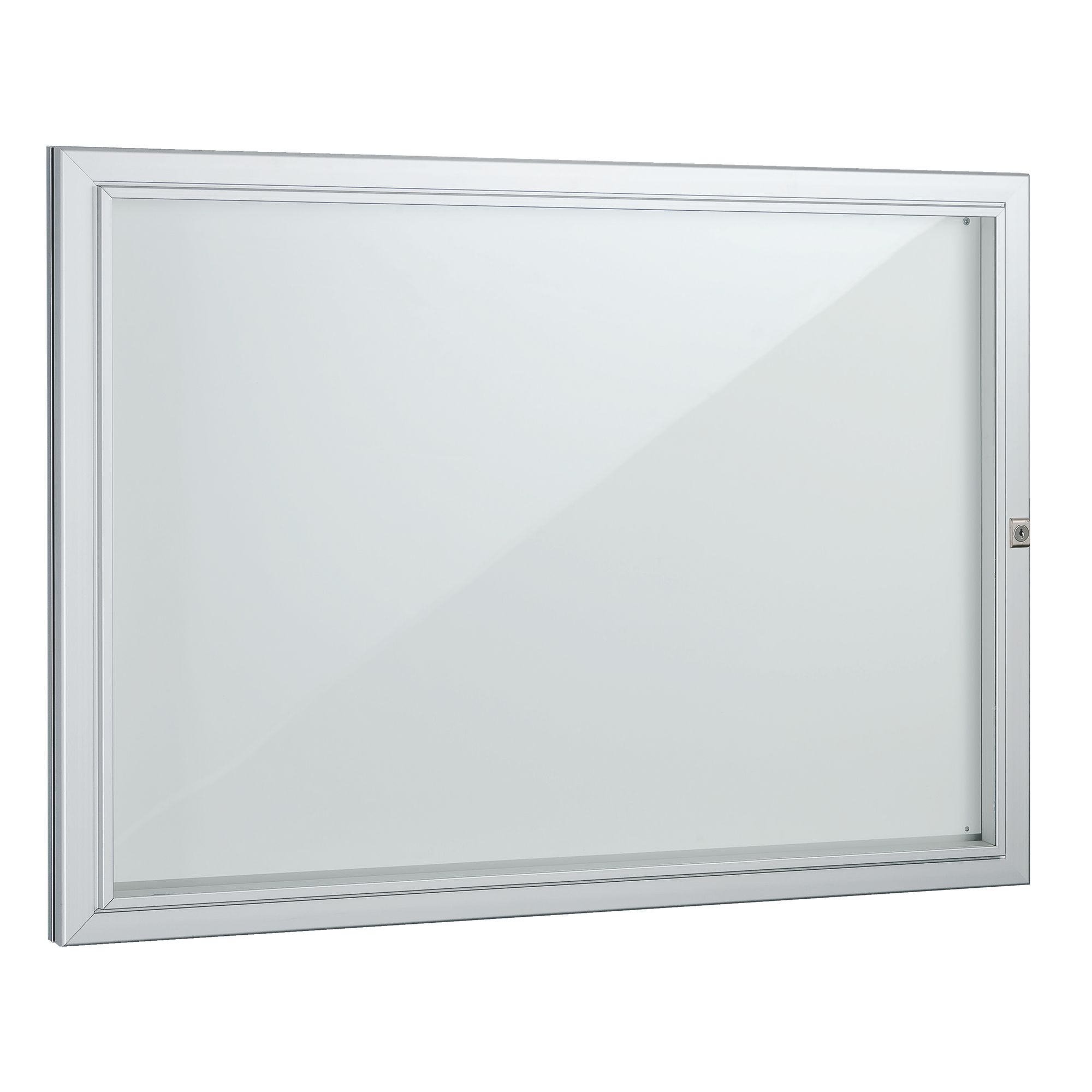 Anodised aluminium frame, 4.5 cm thickSafety glass, 4 mm thick. Light grey metal sidesSwinging doors with lock. Anodised aluminium door frame. Can be placed at the left or the right hand side. Screws included. 4, 8 and 9 page models: 4 mm thick safety glass12 and 18 page models: unbreakable plexiglass18 page model: opens downwards, with door support