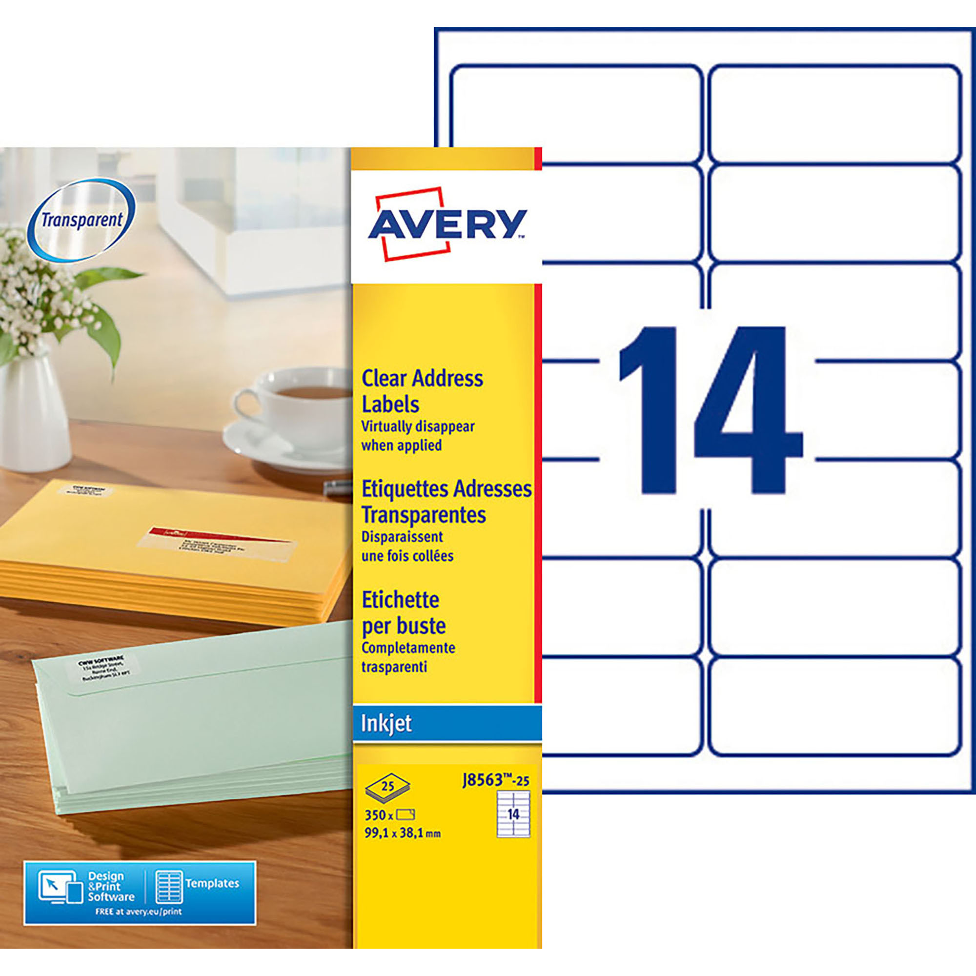 Package of 350 address labels Avery J 8563 99,1 x 38,1 mm for inkjet printer
