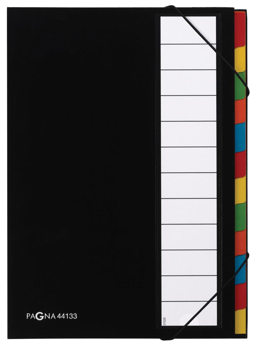 Detailled descriptionPour ft A4. En carton de 225 g/m² avec couverture plastifiée et élastiques. Avec 12 compartiments en couleurs différentes. Couleur: noir.