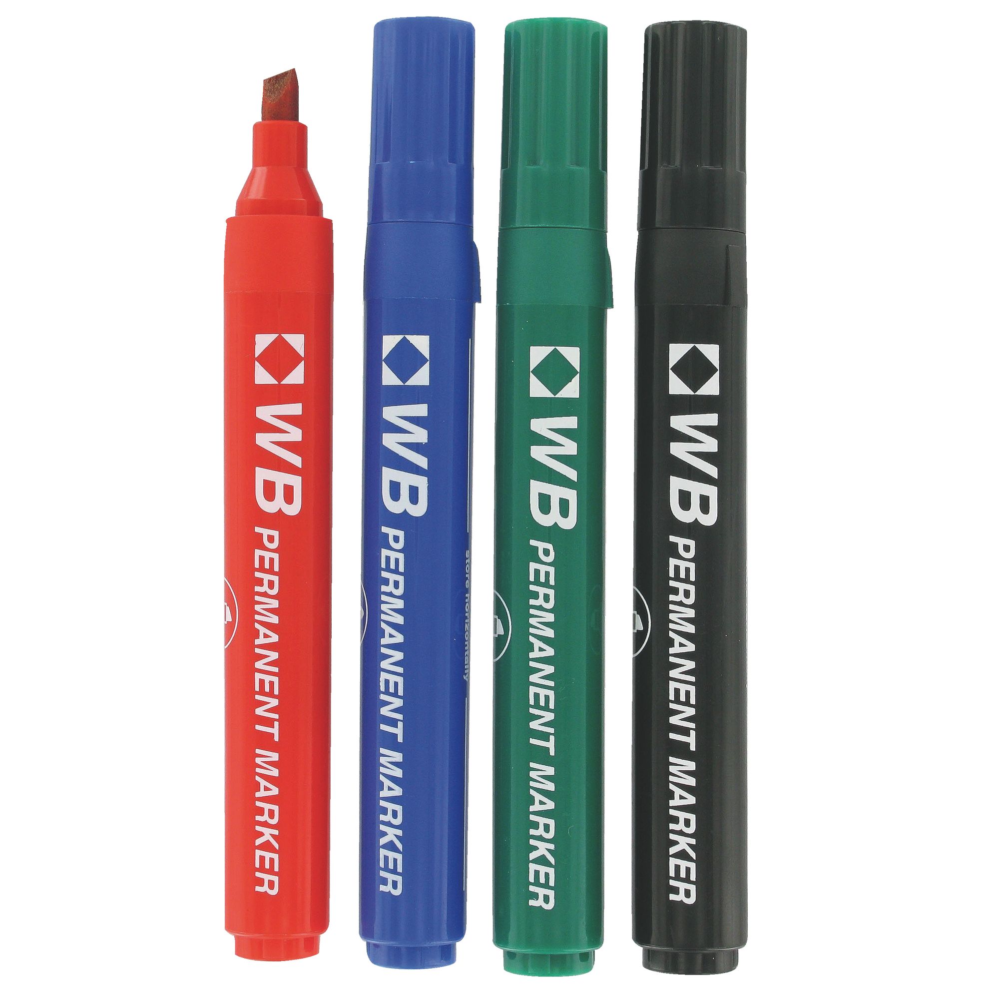 Detailled descriptionIndelible, to write on smooth surfaces. Chisel tip 2 mm. Set of 4 assorted markers: blue, black, red, green.