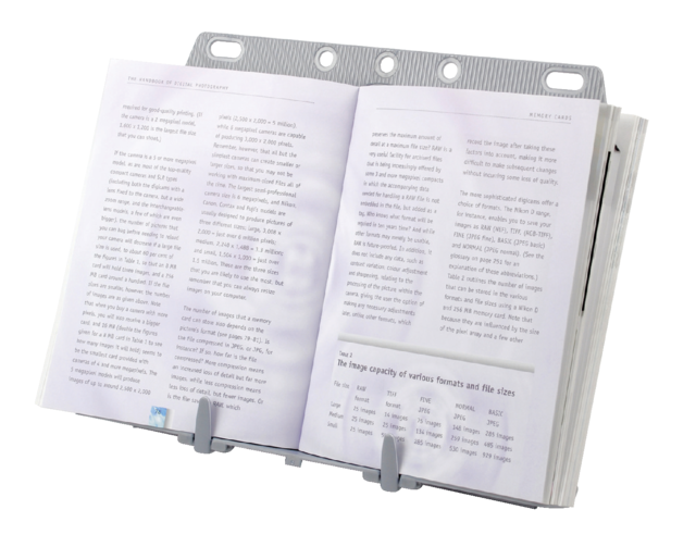 * Porte-livre spécialement conçu pour de large mode d’emploi ou livres. * 2 clips réglables pour maintenir les pages ouverts. * Réglable sur 9 hauteurs pour pratiquement chaque format de livre et angle de vue. * Le pied à l’arrière a un dessous antidérapant et est rabattable. * Permet de tenir les classeurs à anneaux A4.