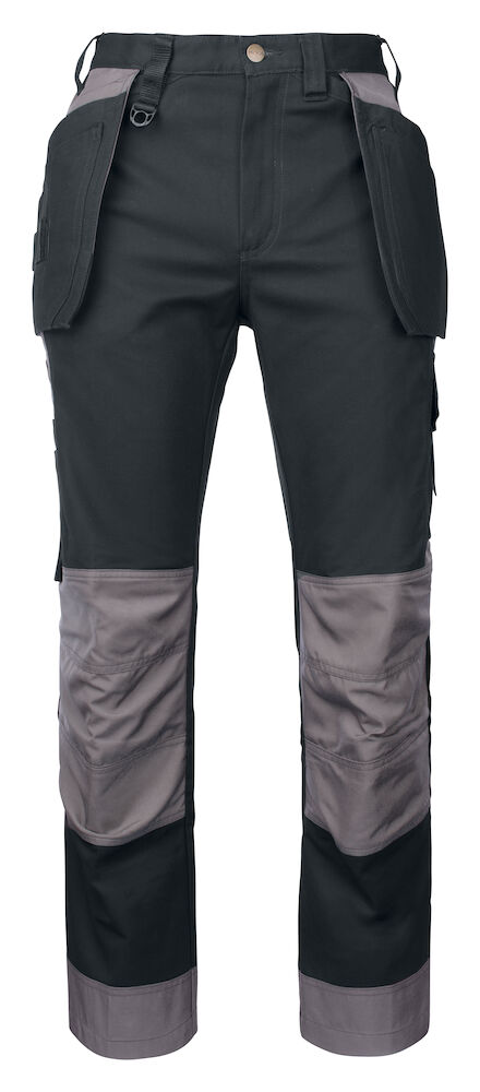 Waistpants in durable cotton and reinforcements in Cordura®. Holster pockets that can be tucked into side pockets on both sides, one with extra pockets and one with loops for tools. Leg pockets, on left side pocket with flap and press-stud closure, internal phone pocket and bracket for ID-card. On the right side pocket for folding rule and pocket for tools with knife button. Back pockets with extra width. Two adjustable hammer loops. Two D-rings fastened at the waistband. Internal pockets for knee protectors, adjustable in two height levels. Holster pockets, back side of leg hems and knees are reinforced with Cordura® for increased durability.