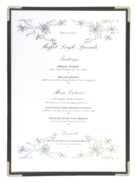 Detailled description* Protège-menu transparent double-face. * Finition avec coins renforcés. * Format A4. * Disponible pour 2, 4 ou 6 pages A4. * La bordure du protège-menu est de couleur marron/noir.