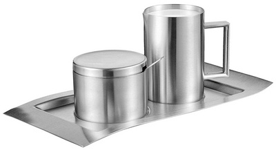 Detailled descriptionEn acier inoxydable, brossé, adapté au lave-vaisselle, secompose de: plateau de 260 x 140 mm, verseuse de 0,25litre, pot à sucre de 0,20 litre avec couvercle et cuillère