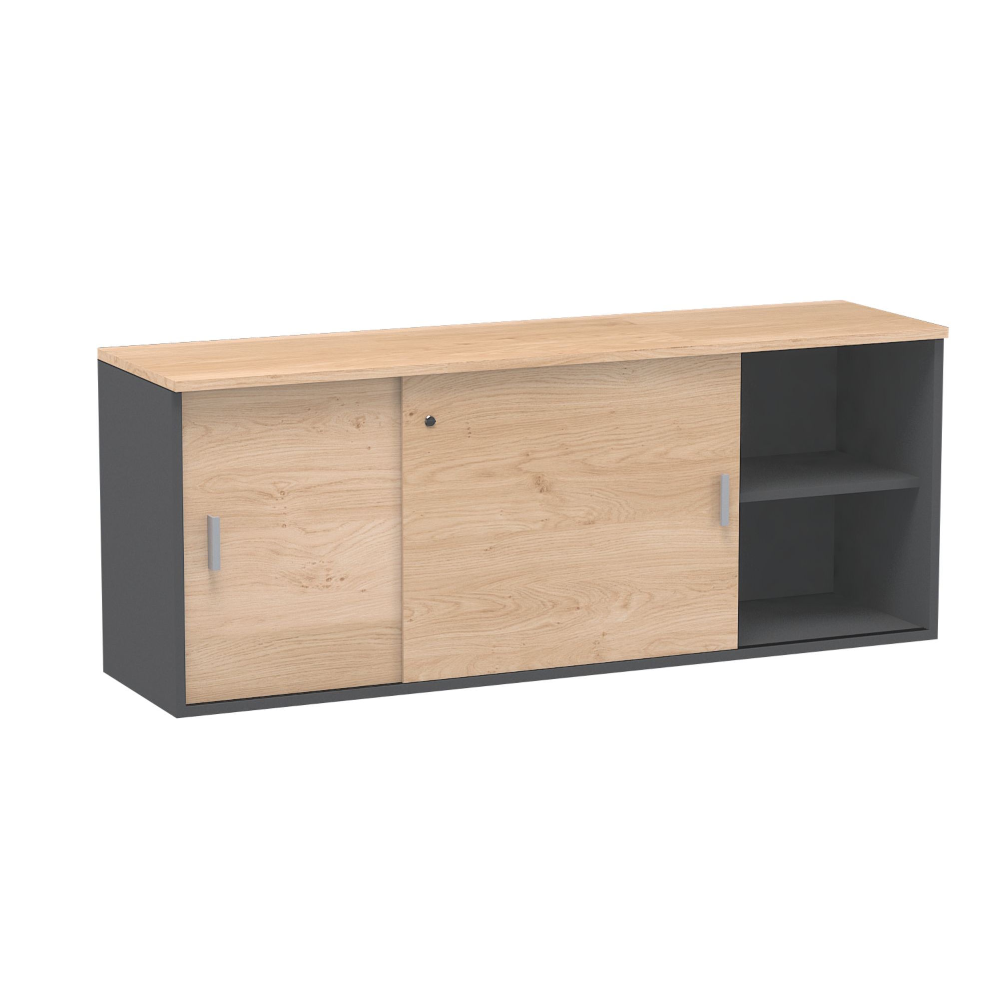 Particle board laminated panels. Middle partition forming 2 compartments each with 1 removable shelf. Sliding doors with lock (2 keys provided). Brushed aluminum metal handles.