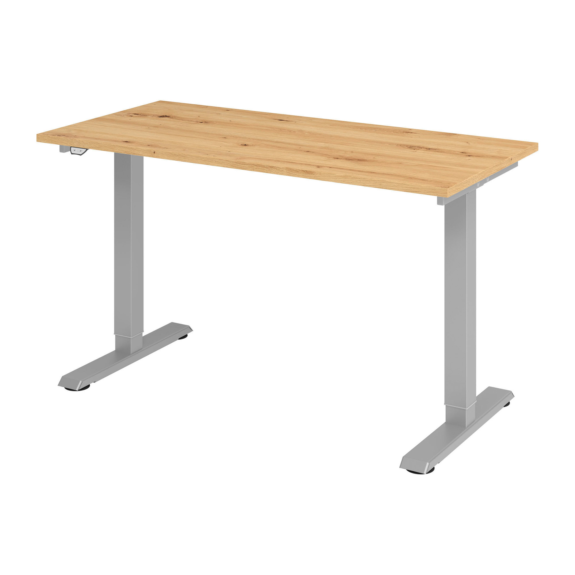 1 safety contact outlet. Extremely sturdy base. Height adjustment ± 5 mm. Silver base, 7 cm square tube, 1 level. Steel frame under the tabletop 4 x 2 cm rectangular tube with a foldable cable duct. Lifting speed approximately 36 mm/sec. 3 m long cable. Table load capacity: 70 kg dynamic, 90 kg static. Tabletop available in 2 colors: amber oak, white. Tabletop dimensions: L 140 x W 67.2 cm.