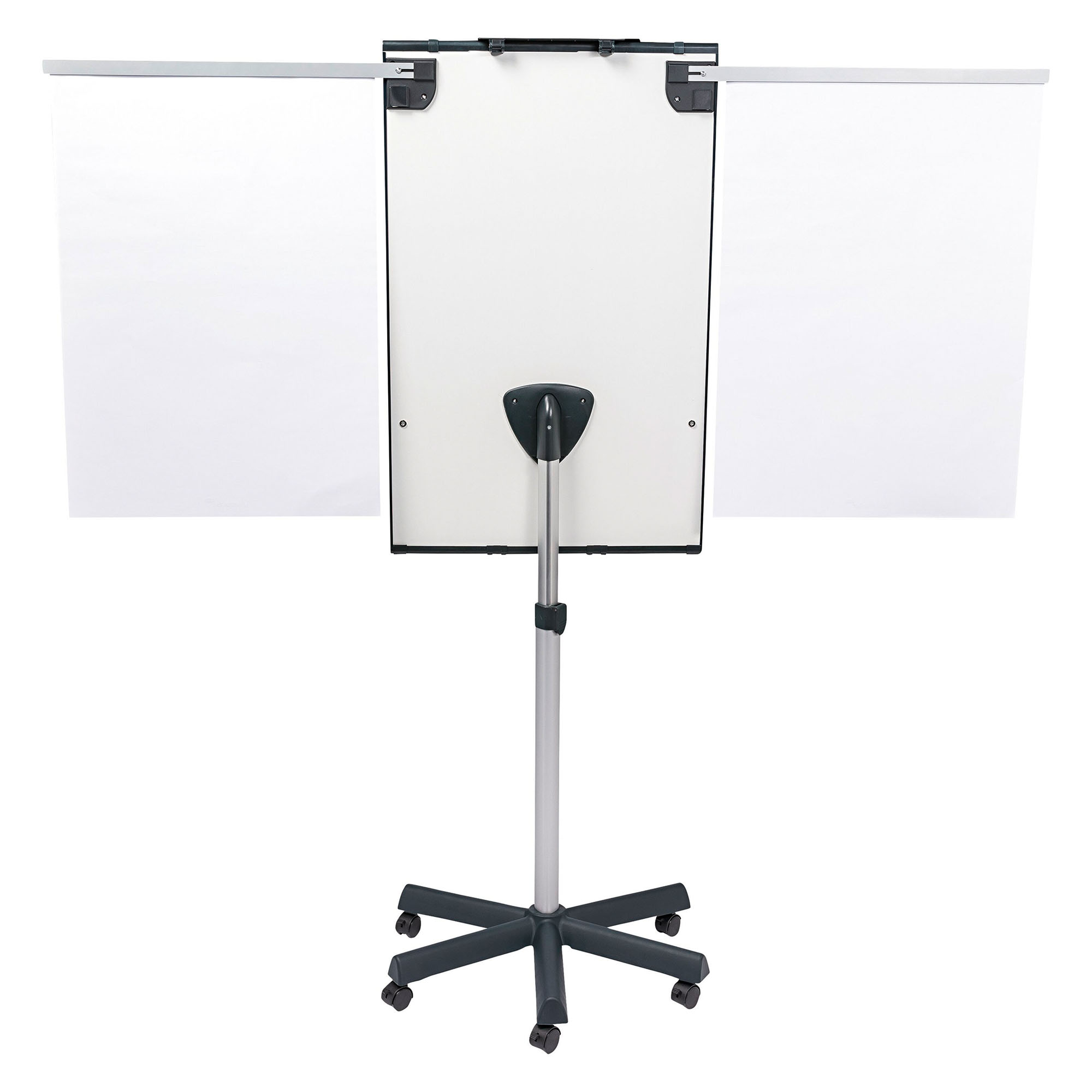 The magnetic and foldable lateral arms provide an additional presentation area, ideal for collaborative sessions or extensive presentations. The easel stands on a round base equipped with 5 lockable wheels, ensuring both smooth mobility and perfect stability when needed.