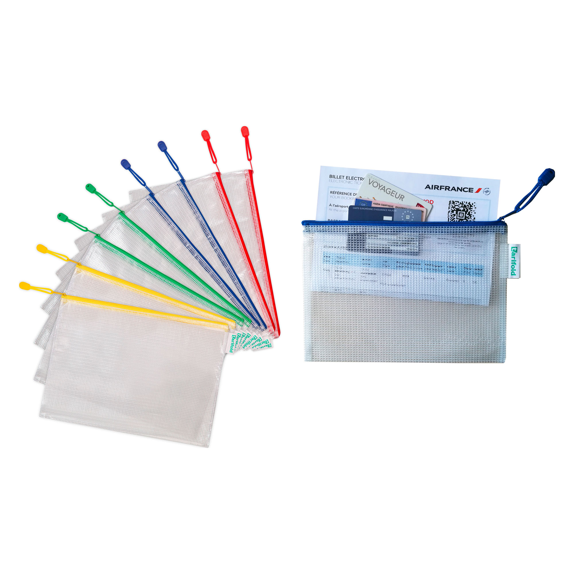 Detailled descriptionPerfect for protecting and carrying documents up to A6 format.Zip closure with strap and edging in 4 assorted colors (yellow, green, blue, red) for color-coded organization.Transparency of PVC allows recognition of the document or object inside.Reinforced flexible PVC, 230 microns thick.Internal dimensions: 160 x 110 mm, external dimensions: 175 x 125 mm
