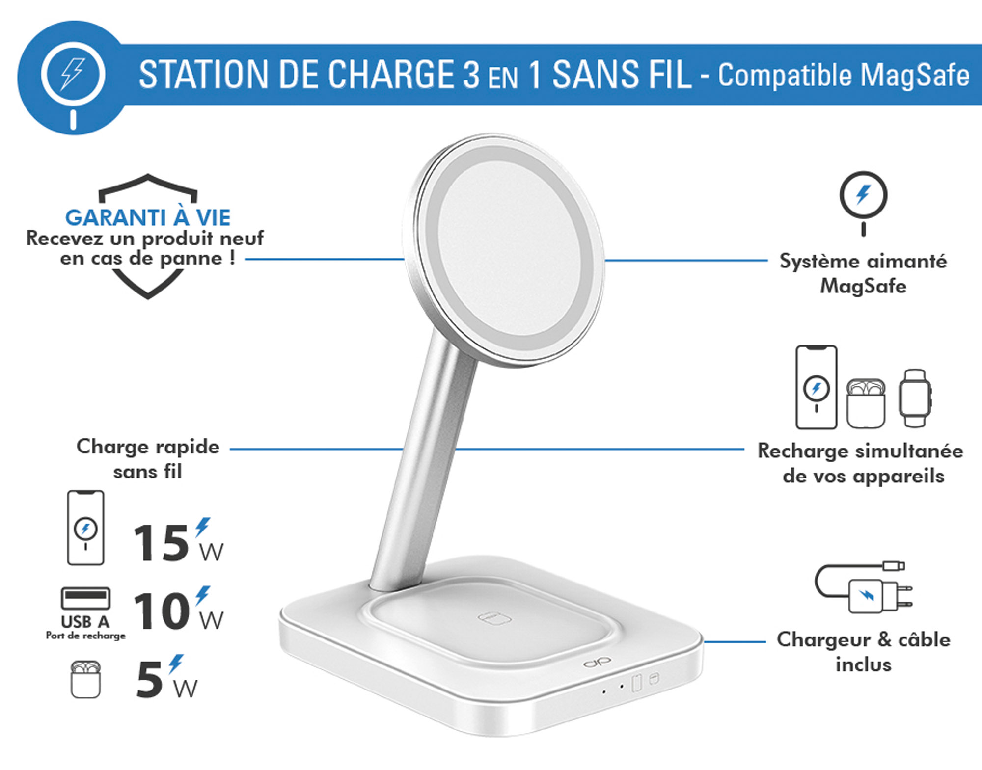 Ce chargeur multifonction est à la fois élégant et simple d'utilisation. Il offre la recharge sans fil la plus rapide qui soit.