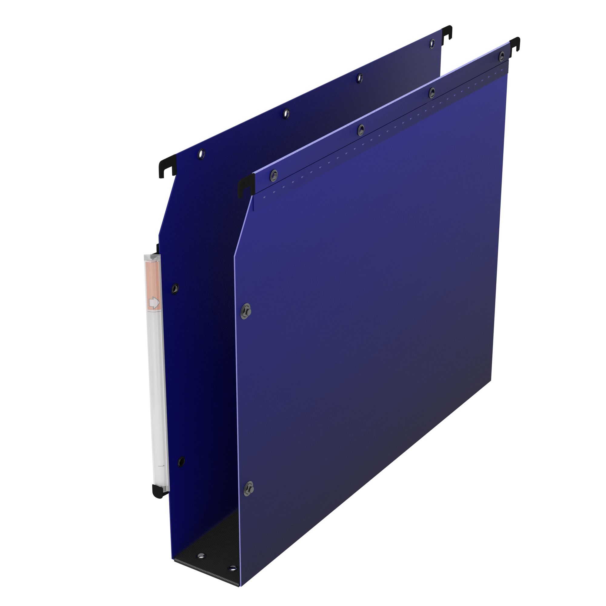For cabinets. Perfect for heavy files. With metallic press-studs and plastic hooks. Metal suspension rods. Label holder with magnifying glass-effect (labels are included). Continuous system with press-studs. In opaque plastic polypropylene 5/10, strong and washable. Axis distance 33 cm. Size 24 x 32 cm. Bottom 80 mm. Colour: blue or red.