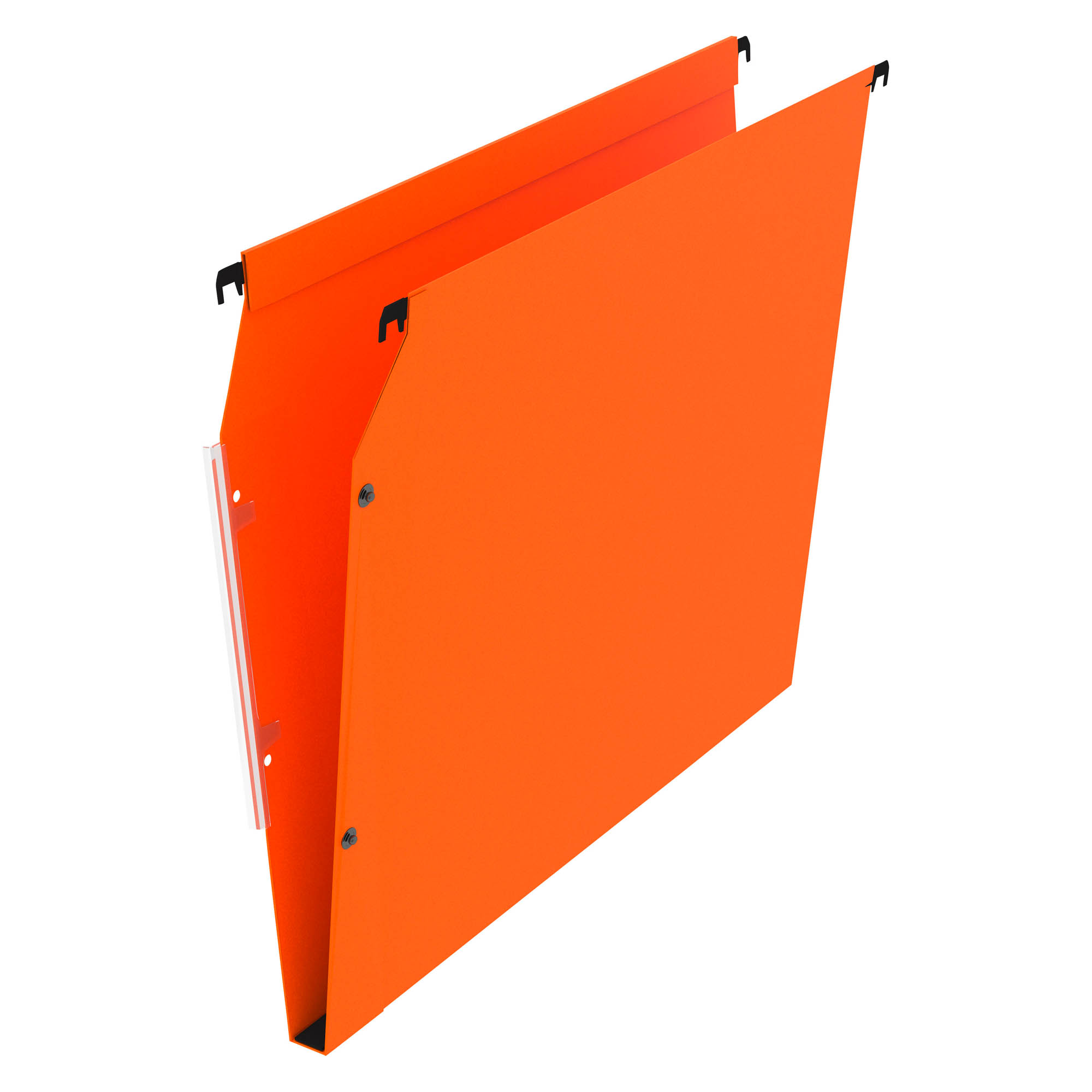 For cabinets. Label holder with magnifying effect (labels are deliverd). Mixed continuous system with stapling flap and push buttons, for a universal compatibility. Hanging rods with plastic ends. Kraft cardboard 240 g, very good resistance. Size 24 x 32 cm. Axis distance 33 cm. Bottom 15 mm. Colour orange.