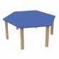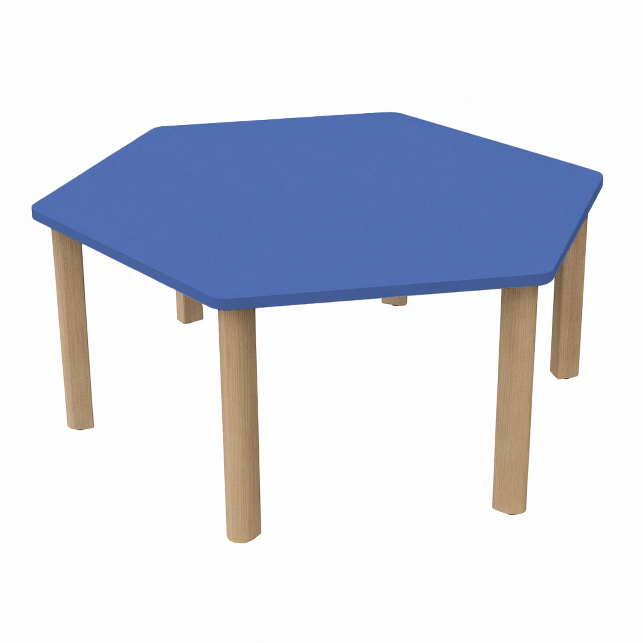 Table hexagonale avec pieds ronds en hêtre massif de section circulaire de 60 mm, polis naturellement et fixés au plateau à l'aide d'un système d'emboîtement a collier. Le plateau de la table est réalisé en bois de conglomérat de haute densité recouvert de mélamine pour une épaisseur totale de mm 25. Les bords sont arrondis en ABS avec des angles d'un rayon de 44 mm. Accessoires pour la base des pieds, pieds réglables pour mettre la table à niveau. Dimension : P 130X L 65 cm. Taille T1 : hauteur 46 cm Hauteur disponible selon la norme 1729-1