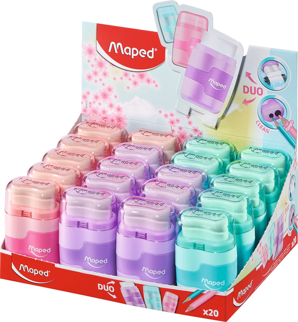 Taille-crayon Maped Connect avec gomme 2 trous présentoir 20 pièces pastel assorti