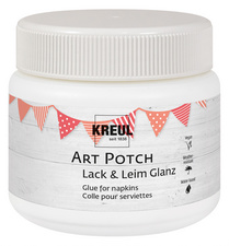 Présentation du Vernis et colle pour serviettes ART POTCH, brillant<br /><br />Explorez les possibilités créatives du Vernis et colle pour serviettes ART POTCH, brillant, idéal pour réaliser vos projets artistiques et décoratifs sur différentes surfaces. Cette formule polyvalente de 250 ml vous offre à la fois une colle efficace et un vernis protecteur pour vos créations à base de serviettes en papier.<br /><br />Caractéristiques du produit:<br />- Colle à base d'eau<br />- Transparente<br />- Convient pour la technique des serviettes<br />- S'applique sur divers matériaux : terre cuite, bois, céramique, pierre ou carton<br />- Conditionné en flacon plastique<br /><br />Avec ce Vernis et colle pour serviettes ART POTCH, brillant, vous pouvez facilement personnaliser et donner vie à vos objets préférés. Appliquez-le sur une surface propre et sèche, puis positionnez délicatement la serviette en papier et lissez-la pour éviter les plis. Laissez sécher, puis appliquez une couche supplémentaire de vernis pour une finition brillante et protectrice.<br /><br />Ce produit de qualité conviendra parfaitement aux professionnels et aux amateurs d'art. Il vous permettra de réaliser des créations uniques et originales pour décorer votre bureau, votre espace de travail ou pour offrir en cadeau.<br /><br />Optez pour le Vernis et colle pour serviettes ART POTCH, brillant et laissez libre cours à votre imagination tout en bénéficiant d'un produit fiable et performant.