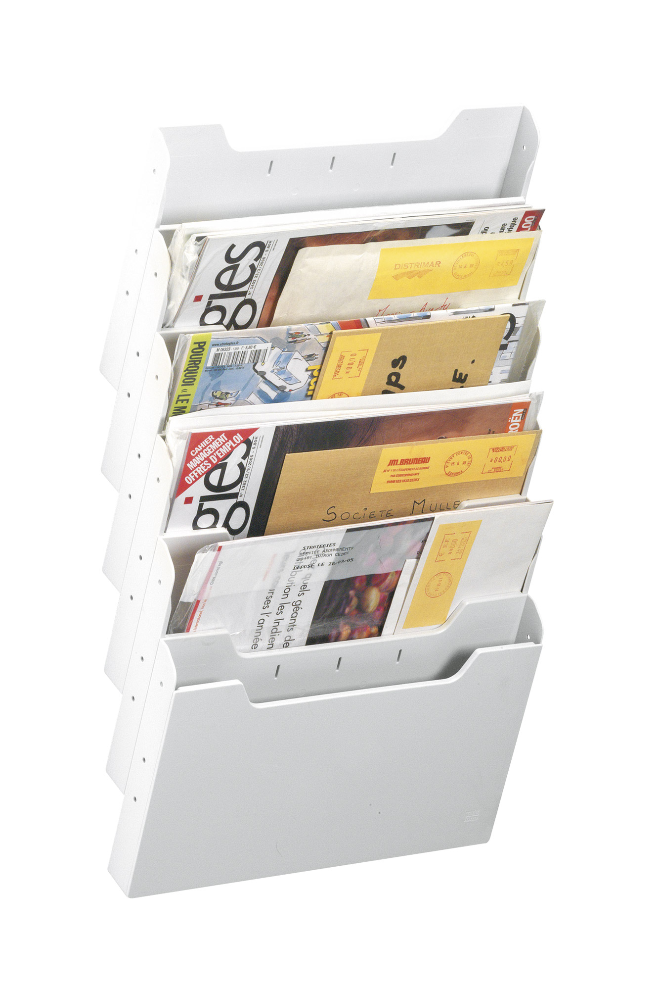 This horizontal wall display with 6 cases from Exacompta has all the trumps you want. Easy to install on a vertical surface thanks to the perforations (delivered with screws). Thanks to the independent elements, you can easily determine the position. You can put documents, mail and magazines up to size 24 x 32 cm in every case.