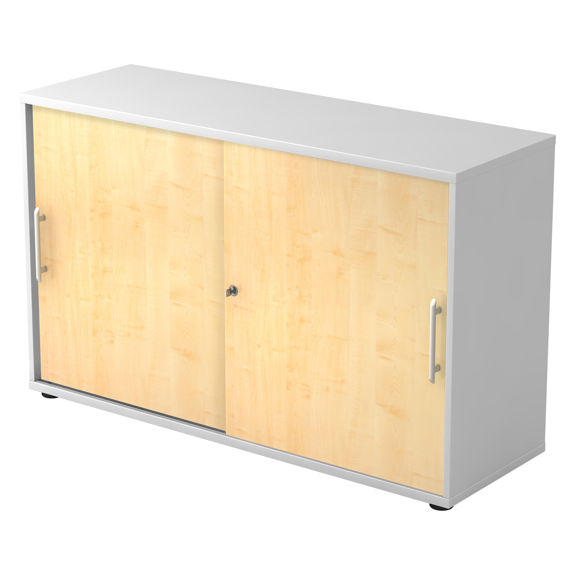 Structure: laminated chipboard (DIN 68765 - E1 category). Front side with 2 mm thick ABS protective strip. Side panels : 16 mm thick, top and lower panels: 22 mm thick. Back: 3 mm (screwed down in grooves) - silver coloured.Lock: "Slide Line" at the bottom on 2 wheels per door in rail (adjustable in height) - on top with 2 blocks per door in rail.Equipment: shelves: 16 mm thick, front side with 2 mm thick ABS protective strip. Adjustable in height every 32 mm. Base: 5 round legs (black - H : 20 mm), on top adjustable in height through bottom.Lock: one cylinder lock for both doors (2 separate locks on demand).Handle: in silver coloured plastic, 128 mm. Carrying capacity: 25 kg/shelf.