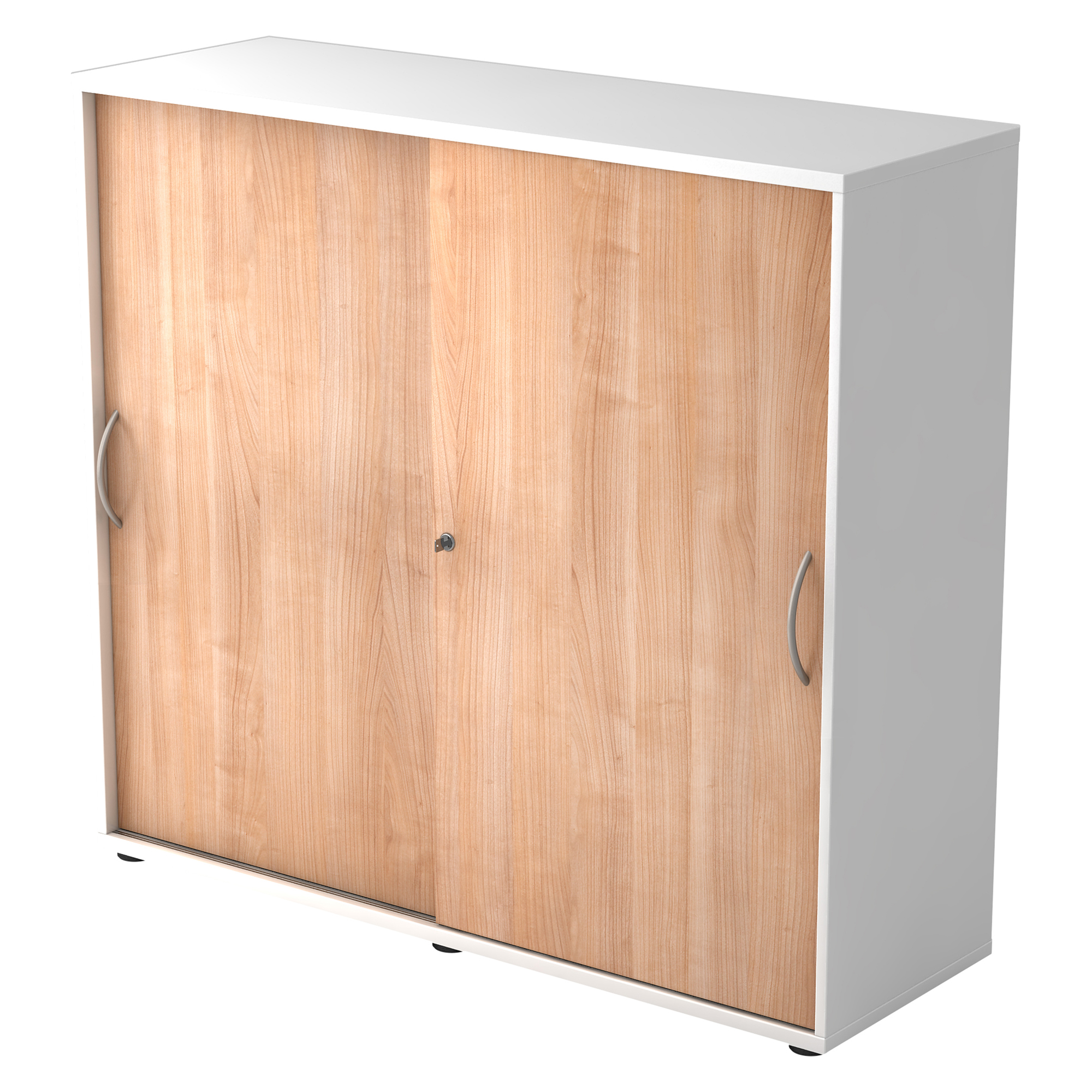 Structure: laminated chipboard (DIN 68765 - E1 category). Front side with 2 mm thick ABS protective strip. Side panels : 16 mm thick, top and lower panels: 22 mm thick. Back: 3 mm (screwed down in grooves) - silver coloured.Lock: "Slide Line" at the bottom on 2 wheels per door in rail (adjustable in height) - on top with 2 blocks per door in rail.Equipment: shelves: 16 mm thick, front side with 2 mm thick ABS protective strip. Adjustable in height every 32 mm. Base: 5 round legs (black - H : 20 mm), on top adjustable in height through bottom.Lock: one cylinder lock for both doors (2 separate locks on demand).Handle: in silver coloured plastic, 128 mm. Carrying capacity: 25 kg/shelf.