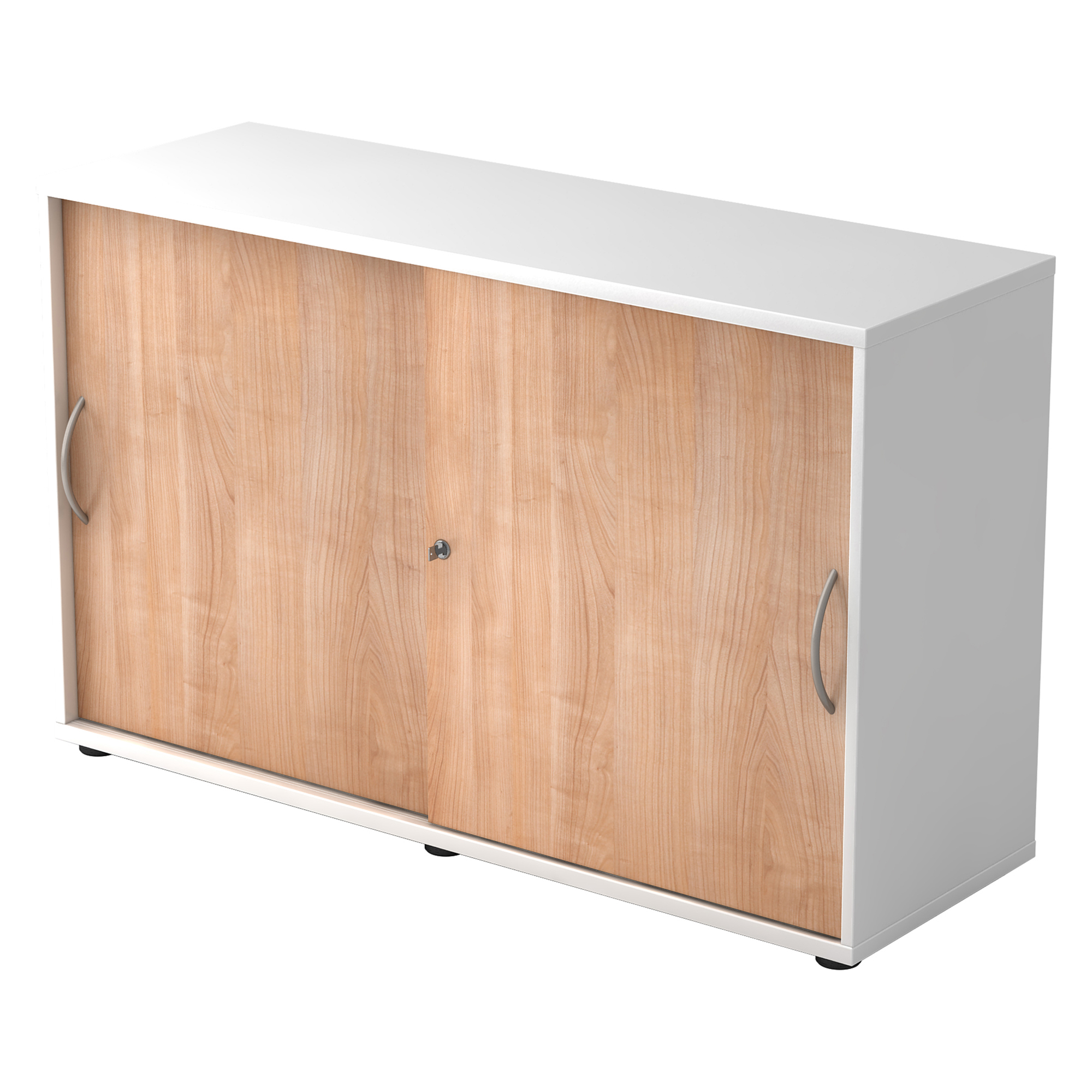 Structure: laminated chipboard (DIN 68765 - E1 category). Front side with 2 mm thick ABS protective strip. Side panels : 16 mm thick, top and lower panels: 22 mm thick. Back: 3 mm (screwed down in grooves) - silver coloured.Lock: "Slide Line" at the bottom on 2 wheels per door in rail (adjustable in height) - on top with 2 blocks per door in rail.Equipment: shelves: 16 mm thick, front side with 2 mm thick ABS protective strip. Adjustable in height every 32 mm. Base: 5 round legs (black - H : 20 mm), on top adjustable in height through bottom.Lock: one cylinder lock for both doors (2 separate locks on demand).Handle: in silver coloured plastic, 128 mm. Carrying capacity: 25 kg/shelf.