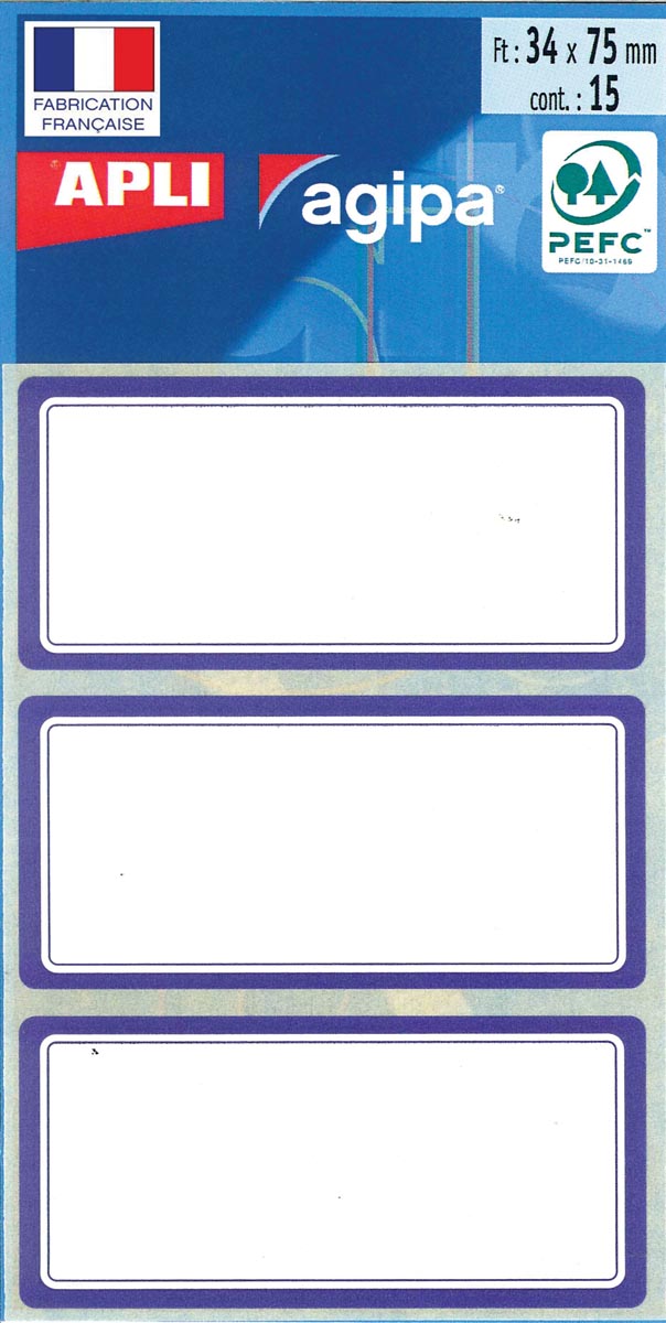 Description détailléeEtiquettes blanches autocollantes avec bord bleu. PEFC certifié. En pochette plastique.
