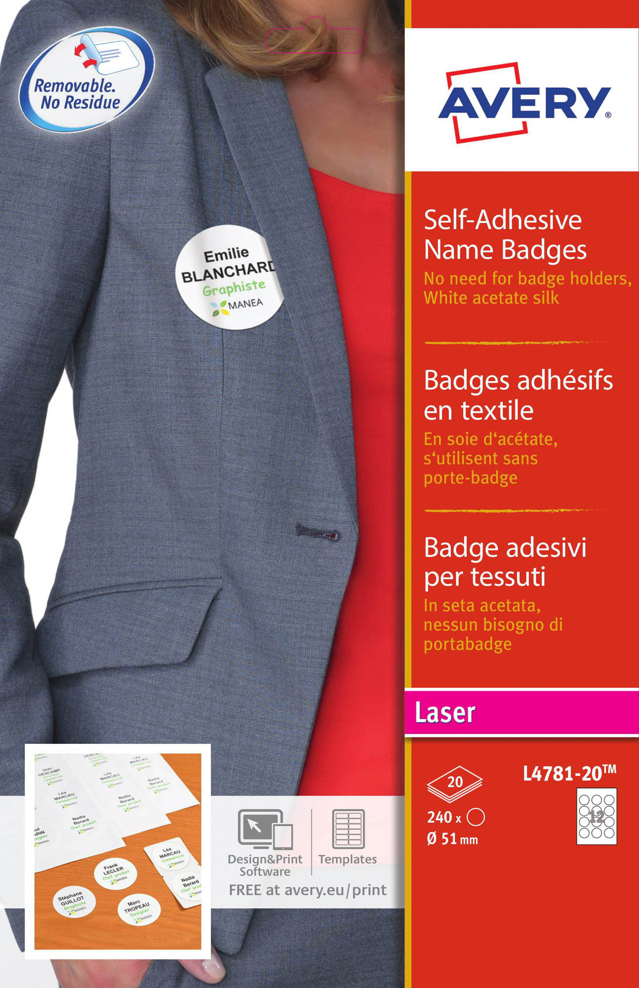 Description détailléeAussi lisible que pratique :le badge laser Avery adhésif vous fera gagner plus de temps en vous évitant la mise sous porte-badgevous n’aurez aucun mal à l’utiliser car il s’adhère fermement aux vêtements et se retire sans laisser de traceen soie d’acétate sans PVC, il s’adapte à tous types de tissus sauf velours, soie et cuirquant à la prédécoupe, elle vous sert à séparer les badges, ainsi, vous pouvez les étaler sur la table et les proposer en self-service aux invitéspour l’inscription, vous aurez le choix entre le manuel et l’impression laserenvie de personnaliser vos badges ? Des modèles et logiciels gratuits sont disponibles sur le site : www.avery.fr. format badge rond : Ø 51 mmboîte de 24 feuilles A4 comportant chacune 10 badges