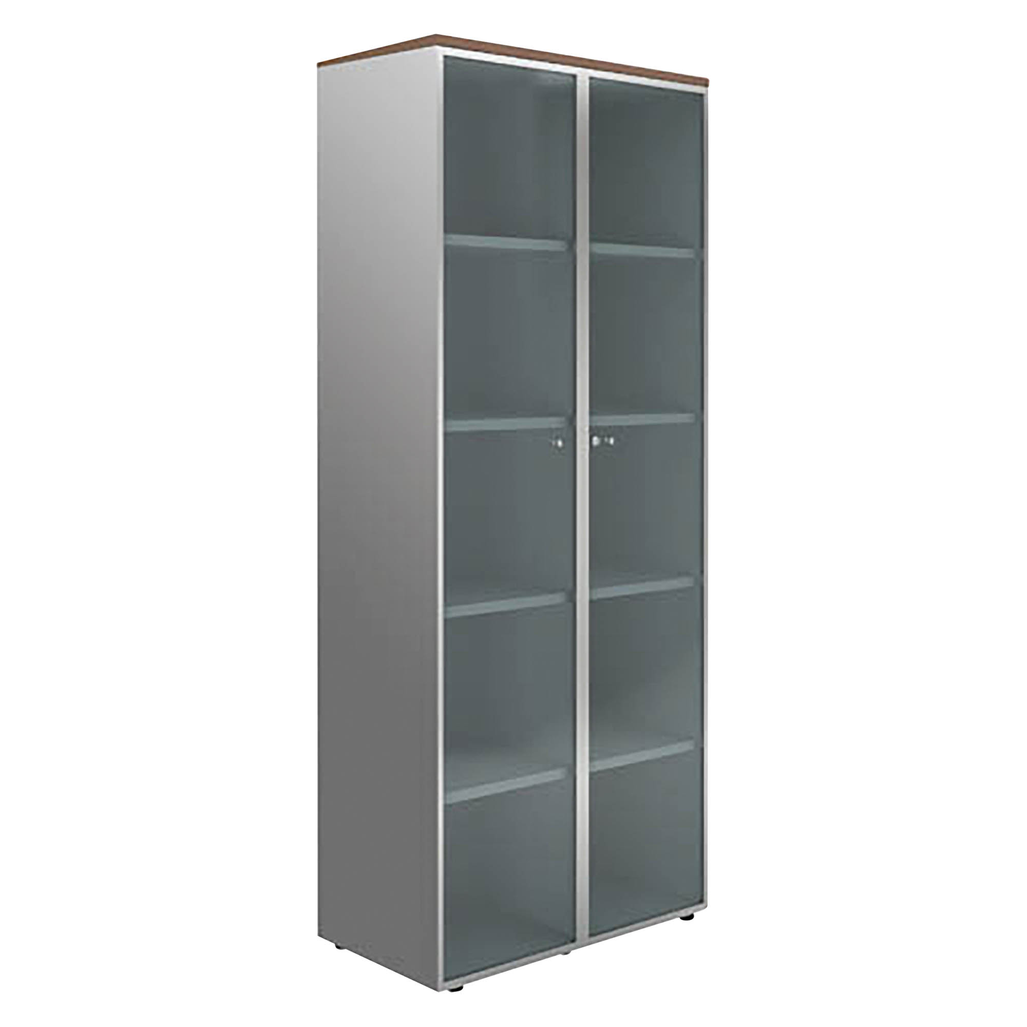 2 portes battantes en verre dépoli, équipées d'une serrure et de poignées avec boutons chromés.