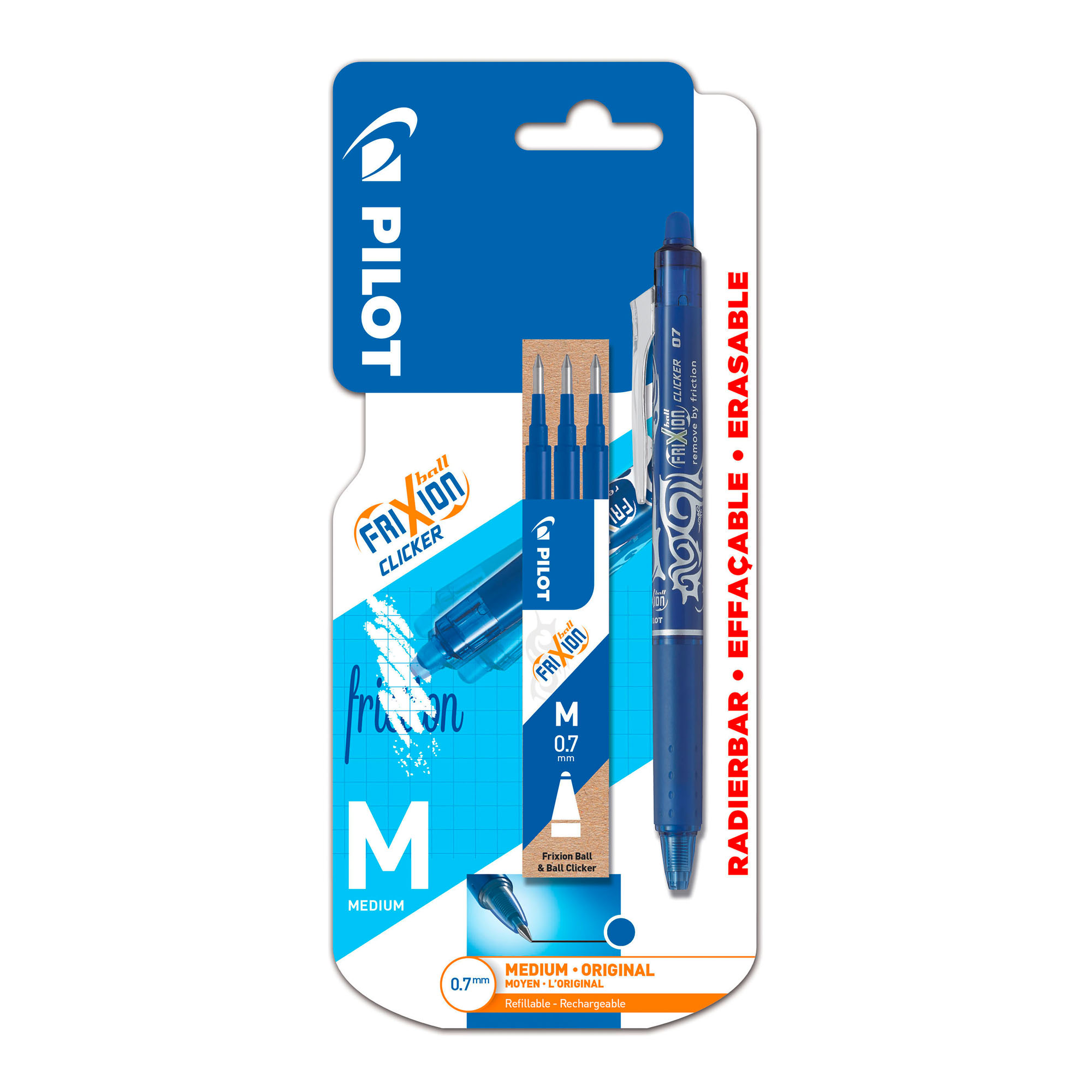Cliquez… Écrivez ... FriXionnez... Recommencez autant de fois que vous voulez avec FriXion ! Ecrivez en souplesse avec la bille moyenne, effacez par échauffement sans abîmer le papier et recommencez sans attendre. Grâce à une nouvelle encre thermosensible brevetée, le FriXion Ball Clicker, fidèle à la tradition PILOT, révolutionne l'écriture. Il affiche sa différence grâce à son click rétractable qui le rends encore plus pratique ! Rechargeable - Ne pas utiliser sur documents officiels.