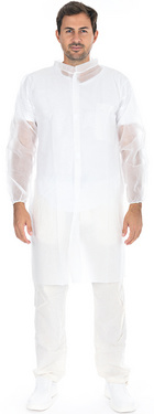 Description détailléeBlanc, en intissé PP, avec col montant, perméable à l'air, à usage alimentaire, périmètre: 1 300 mm, longueur: 1 100 mm en paquet de 50 pièces