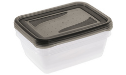 Description détailléeRectangulaire, boîte transparente, couvercle gris avec languette de coin, en PP, dim.: (L)155 x (P)205 x (H)65 mm contenu: 3 pièces couleur du couvercle: crystal grey transparent