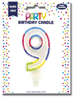 Description détailléeBougie blanche à effet pailleté et bord coloré, double face,pied en plastique, sur carte blisterdimensions de la carte blister: (L)85 x (P)15 x (H)150 mm