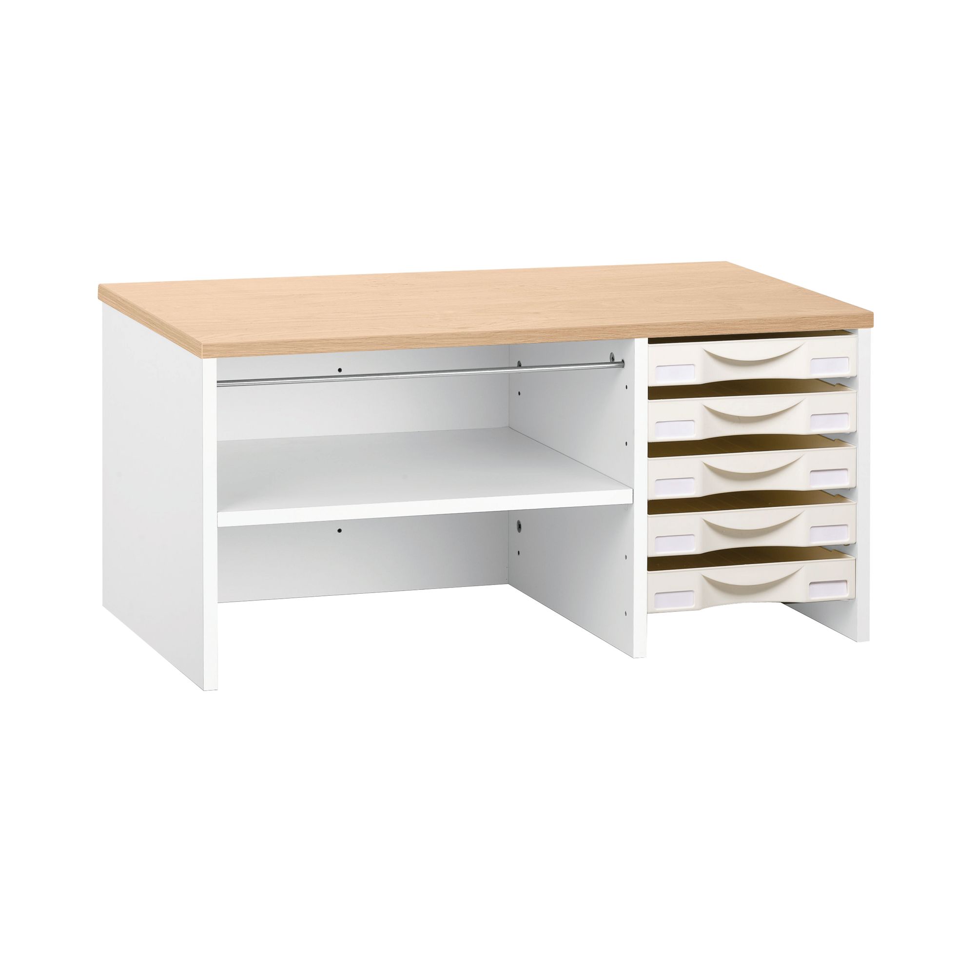 Optimisez la classification de vos documents avec le box de rangement Intuitiv’. D’une grande résistance, ce mobilier est fabriqué dans une matière en panneaux de particules d’une épaisseur de 25 mm. Alliant sobriété et design, cet accessoire arbore une belle finition grâce à son revêtement mélaminé. Le box de rangement Intuitiv’ est équipé de 5 tiroirs en PVC pour faciliter le classement de vos documents. Lors du montage, ils peuvent être positionnés à gauche ou à droite selon vos besoins. D’une grande praticité, ce mobilier dispose d’un compartiment de rangement équipé de 2 rails métalliques. Celui-ci permet d’accueillir jusqu’à 40 dossiers suspendus. Ce modèle se décline en différents coloris top de finitions afin de s’accorder à tous les styles de bureau : blanc, chêne clair, vert, bleu et violet.