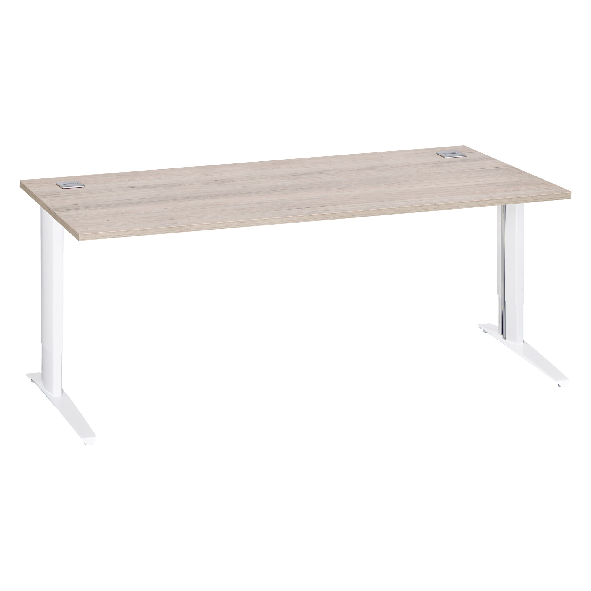 - Pieds métal en L réglables en hauteur de H 67.5 à 87.5 cm (incluant le plateau) et poutre métal sous plateau pour plus de solidité et stabilité. Crantage et réglage possible tous les millimètres.