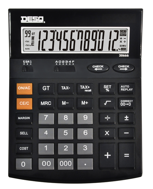 * La calculatrice de bureau professionnelle Heavy Duty unique avec affichage à 12 chiffres. * Avec face en métal et dotée de toutes les fonctions commerciales pratiques. * Touches de formes ergonomiques conçues pour un mouvement naturel des doigts pour une frappe agréable même en cas d’utilisation prolongée. * Double alimentation : énergie solaire/pile. * Mode d'arrêt automatique pour économiser l'énergie. * Pieds en caoutchouc. * Ecran LCD large et incliné, parfaitement lisible. * Fonction Check & Correct Functie => 120 pas en arrière Relecture/Examen automatique. * Face en métal noir mat. * Fonctions pratiques : TAXE / Coût / Vente / Marge -GT-00-000. * Ecran LCD avec verre acrylique. * 3 touches mémoire. * Signes de commande de fonction : Le signe de l’opération en cours est affiché au-dessus des chiffres. * Sélecteur d'arrondi et de décimale. * Dimensions : 187x142x36mm.