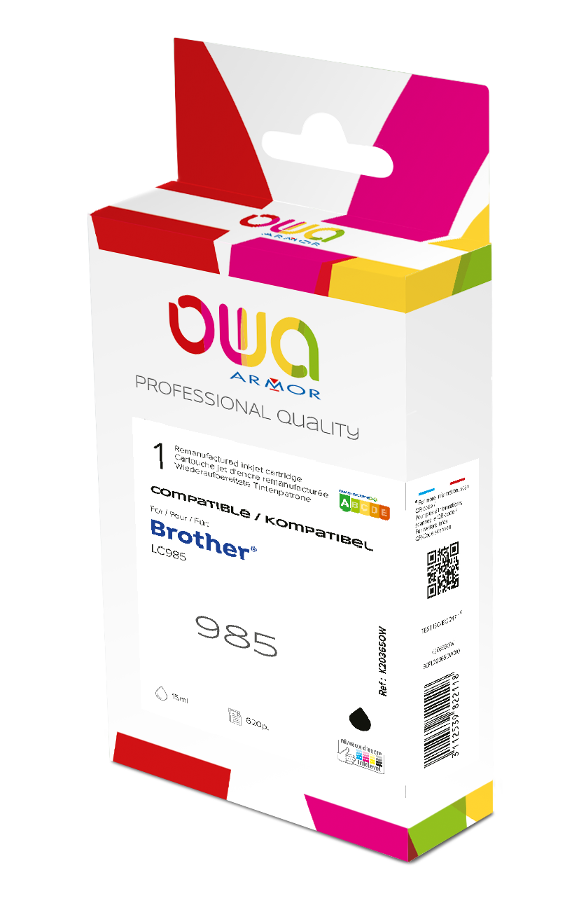 Autres cartouches avec les mêmes compatibilitésPack de 4 cartouches d'encre remanufacturées OWA - standard - Noir Cyan Magenta Jaune - pour BROTHER LC985 B, LC985 C, LC985 M, LC985 Yà partir de25,95 € htCartouche d'encre remanufacturée OWA - standard - Noir - pour BROTHER LC985 Bà partir de7,15 € htCartouche Brother LC985 couleurs séparées pour imprimante jet d'encre20 avisà partir de12,50 € htCartouche Brother LC985 noire pour imprimante jet d'encre30 avisà partir de23,12 € htBrother LC985 Pack cartouche de 4 couleurs pour imprimante jet d'encre27 avis57,60 € ht