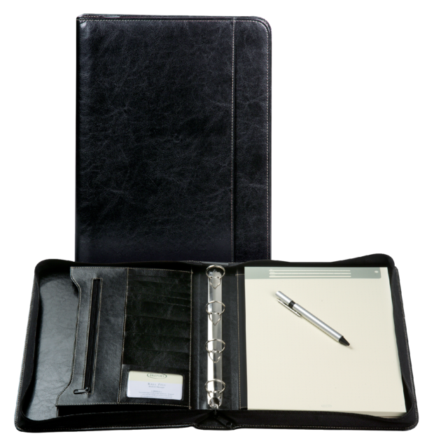 Description détaillée* Conférencier de luxe en matière similicuir. * Format A4. * Avec bloc-note. * Mécanisme à 4 anneauxde 20mm et fermeture éclair. * Dimensions 255x345mm.