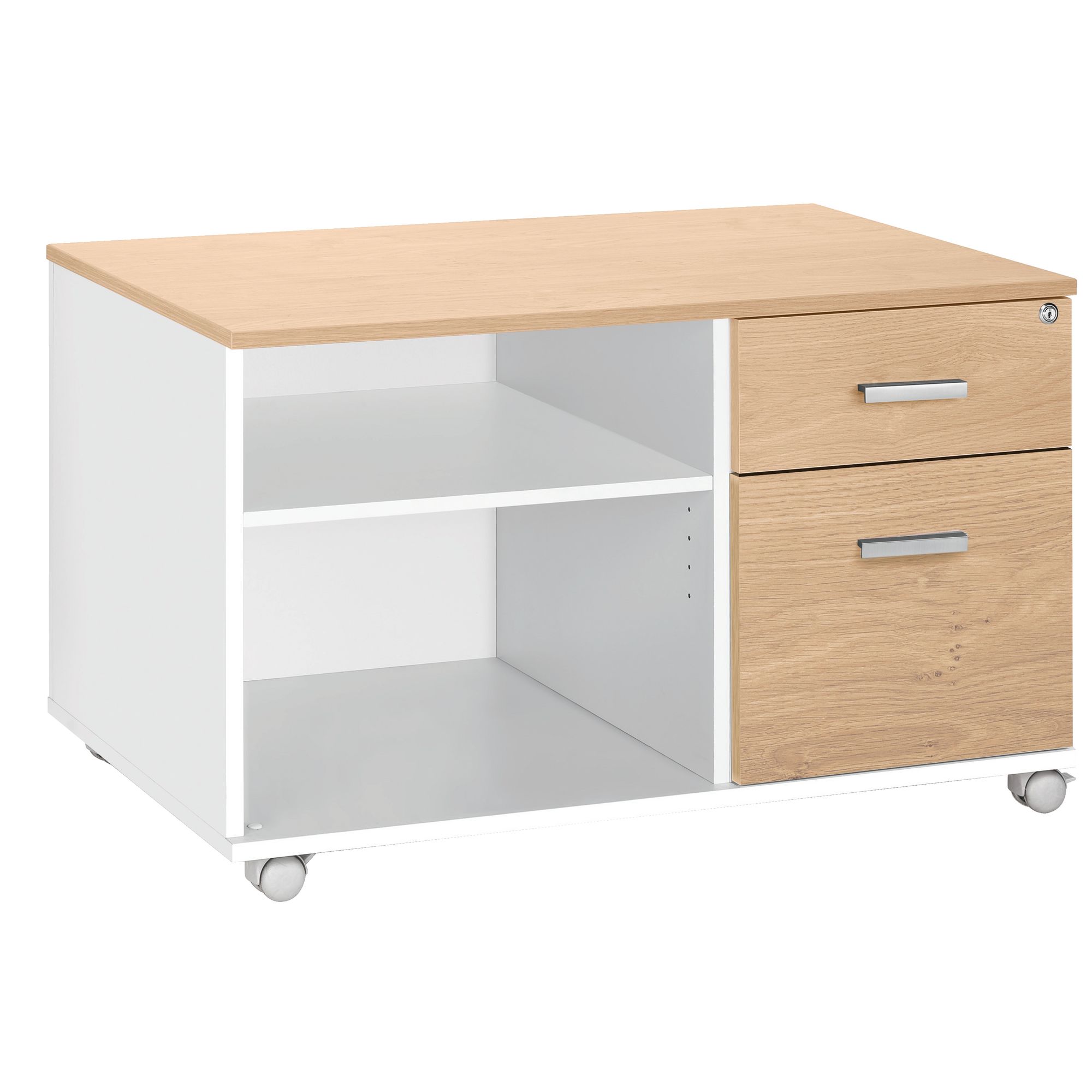 1 tiroir pour dossiers suspendus et 1 tiroir de rangement à plat.