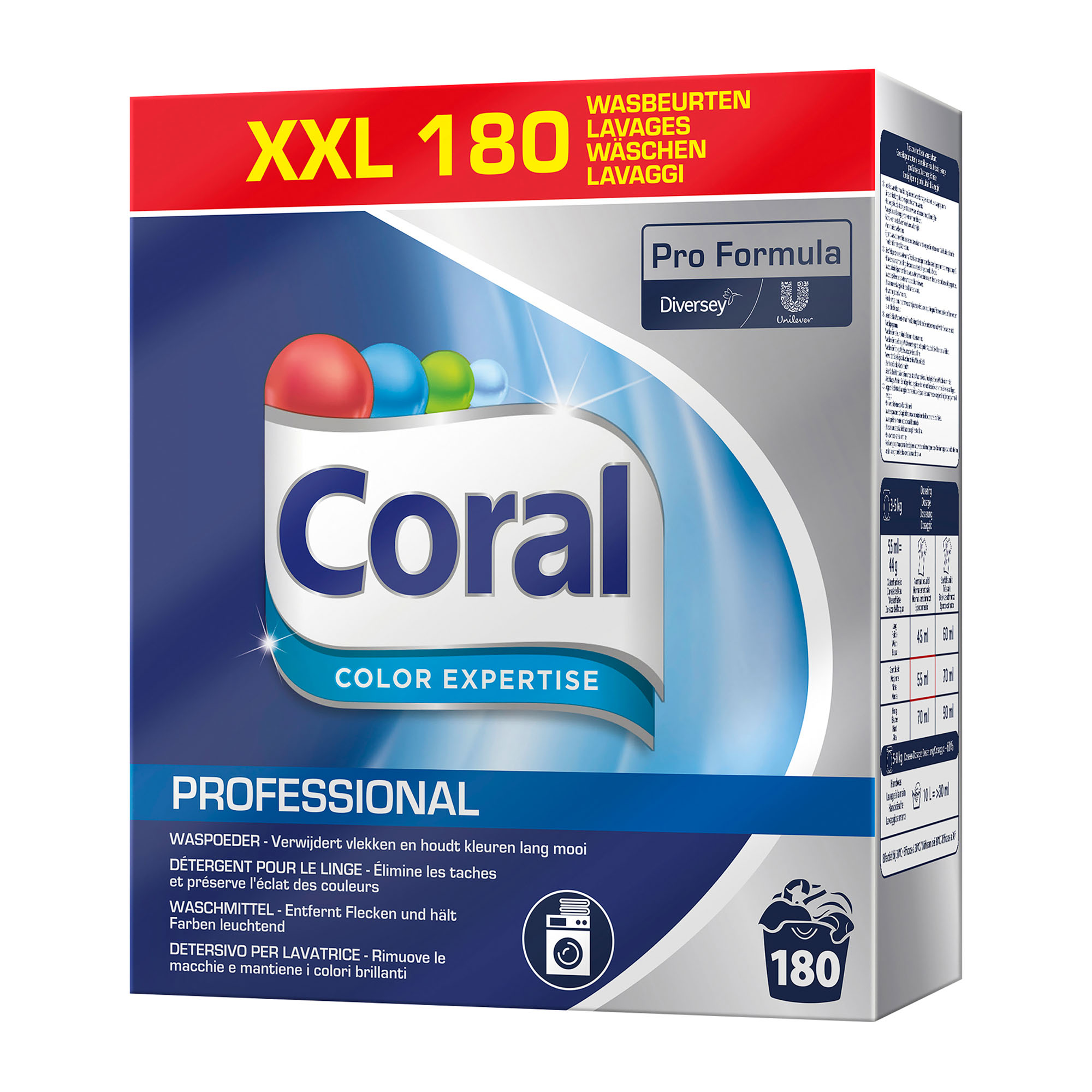 Description détailléeDétergent Professional pour le linge. Elimine les taches et préserve l'éclat de couleurs. Lessive pour le linge coloré. Efficace à 30°C. 180 lavages.
