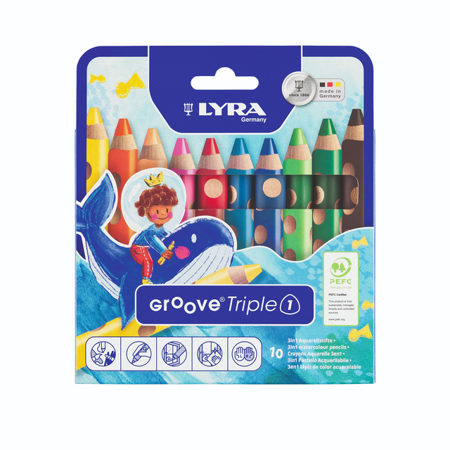 Lyra Groove Triple One est un crayon trois en un : crayon aquarelle, crayon de couleur et craie à la cire. Bonne couverture, peut être mélangé à l'eau. Longueur 12cm, mine extra-épaisse de 10mm, forme triangulaire ergonomique avec rainures antidérapantes. Boîte de 10 crayons de couleurs.