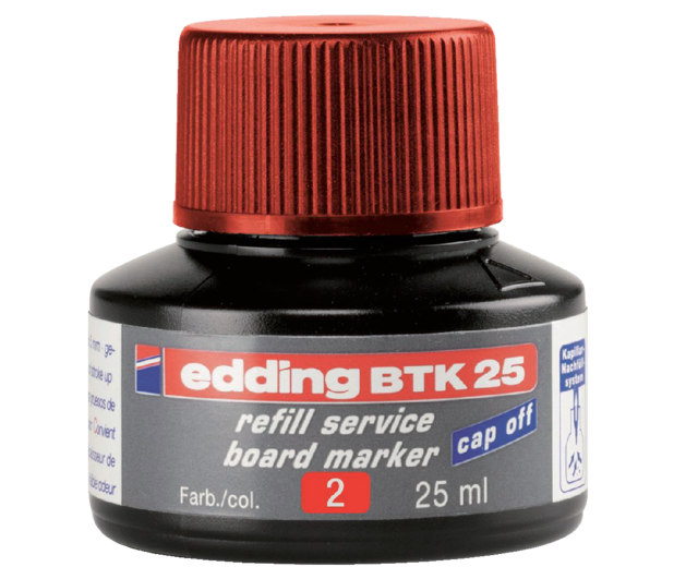 * Pour recharger les marqueurs edding 28 / 29 / 250 / 360 / 361 et 363 pour tableaux blancs. Encre pigmentée à odeur neutre dans un flacon à système de recharge par capillarité. * Placer le marqueur pointe en bas, pendant au moins une heure dans le flacon de recharge, idéal le laisser toute la nuit. * Ensuite le marqueur est prêt à l’utilisation. * Contenu 25ml.