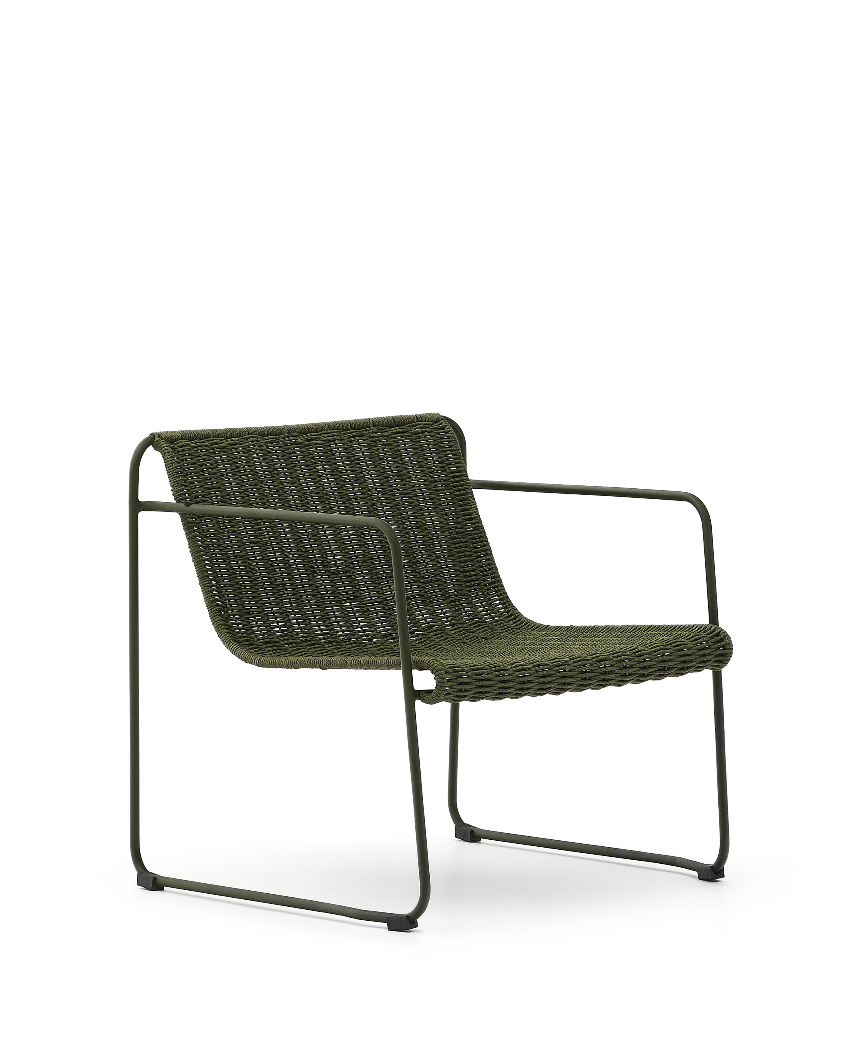 Fauteuil avec assise et dossier en corde verte tressée à la main et résistante aux rayons UV.